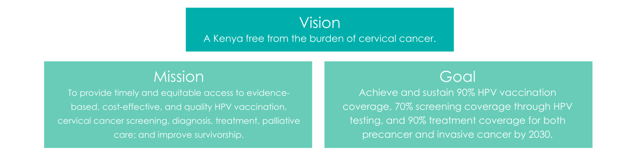 The systems, structures, and processes through which cervical cancer programs are led and managed— ensuring accountability, transparency, equity, and responsiveness. Strong governance ensures clear roles, effective oversight, and alignment with national health priorities and policies. The structures include the Non- communicable Disease Interagency Coordinating Committee (NCD- ICC), the National Cervical Cancer Elimination TWG, County NCD TWGs and School Health Coordination mechanisms.