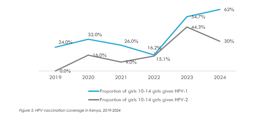Since its 2019 rollout, Kenya’s HPV vaccination program has remained low in coverage due to COVID-19 disruptions, limited access in marginalized communities, and systemic delivery and policy gaps; by 2023, only 54.7% of girls aged 10–14 had received one dose and 44.3% had completed two (figure 5).