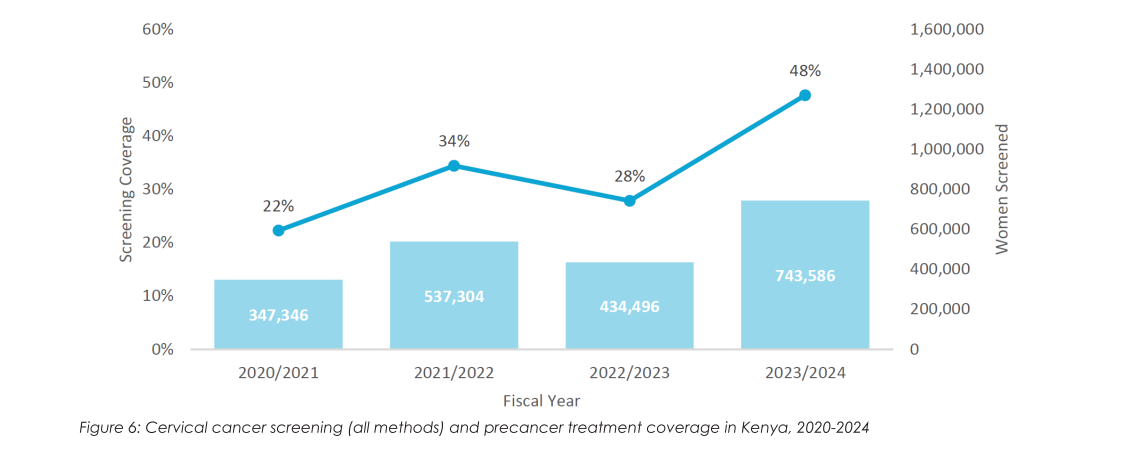 Cervical cancer screening and treatment coverage in Kenya remains low, with significant disparities across counties. Despite efforts since 2011 using VIA and cryotherapy, coverage falls far below the 70% target, with most women screened using less accurate VIA instead of the recommended HPV testing (figure 6). Barriers include limited facility infrastructure, inadequate trained personnel, long distances to screening sites, and lack of integration of services. Though thousands of providers have been trained and equipment distributed, HPV testing still accounts for less than 6% of screenings due to lack of funding for commodity procurement and systems strengthening, logistical challenges, referral bottlenecks, and tracking issues.